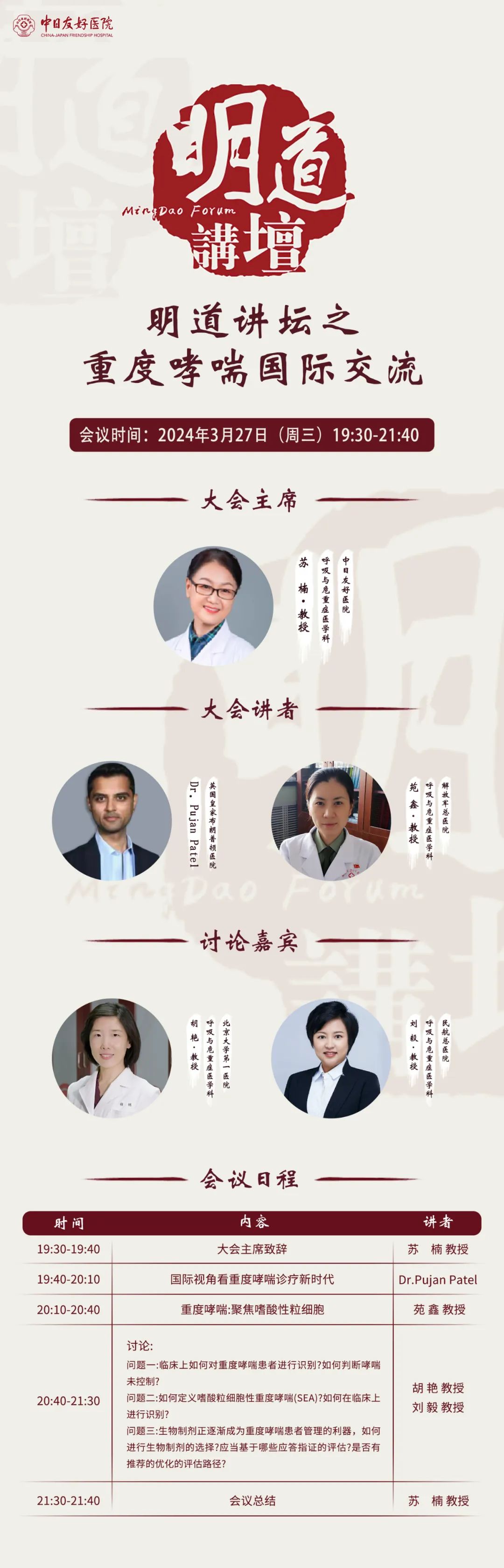 2024年3月27日PujanPatel教授参加了国家呼吸医学中心中日医院的明道讲坛“重度哮喘国际交流会”,来自解放军总医院的苑鑫教授、北京大学第一医院的胡艳教授以及北京民航总医院的刘毅教授也参加了本次国际学术交流会,就重度哮喘的诊疗评估,生物制剂选择,以及国际与国内诊疗现状等话题展开了学术交流和讨论。