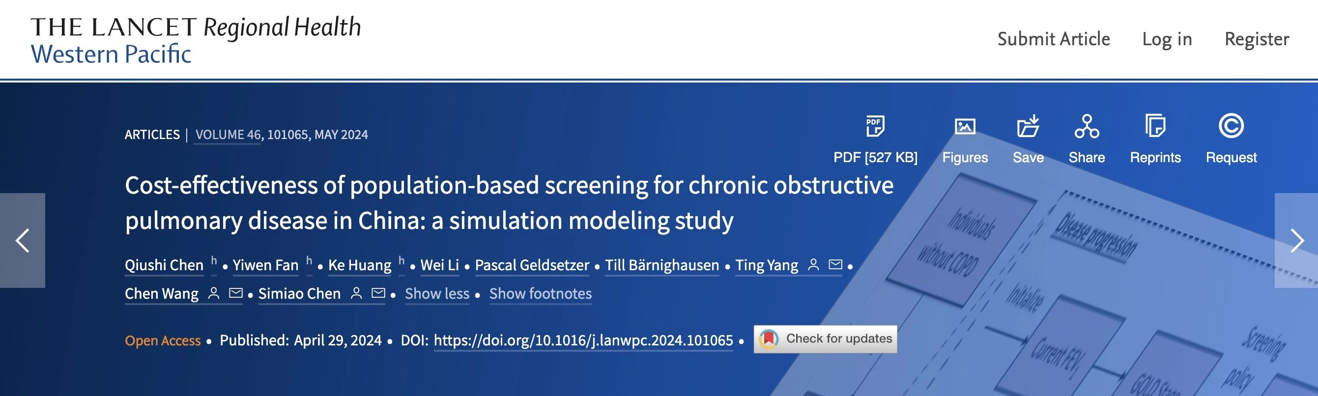 国家呼吸医学中心、中日医院呼吸中心、协和医学院王辰、杨汀、陈思邈教授团队近日以封面文章在《柳叶刀-区域卫生(西太平洋)》发表最新研究成果,题为“基于中国社区人群的慢阻肺病筛查成本效益分析:一项仿真建模研究”(Cost-effectivenessofpopulation-basedscreeningforchronicobstructivepulmonarydiseaseinChina:asimulationmodelingstudy)[1]。