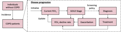 研究建立了一个新的微观仿真模型(COPD-SIM)模拟我国35至80岁人群的慢阻肺病患病、发病、疾病进展和临床管理(图1),并对照从王辰院士牵头开展的中国成人肺部健康调查(ChinaPulmonaryHealthStudy,CPHStudy)[2]中取得的慢阻肺病流行病学数据进行模型校准。