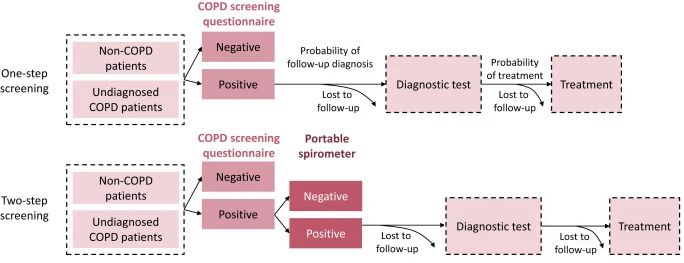 研究设计并对比了多种组合的慢阻肺病筛查策略,包括一步筛查(仅问卷)和两步筛查(问卷与便携式肺功能仪相结合)以及不同的筛查频率(一次性筛查、每1年至每10年一次的重复筛查)(图2)。
