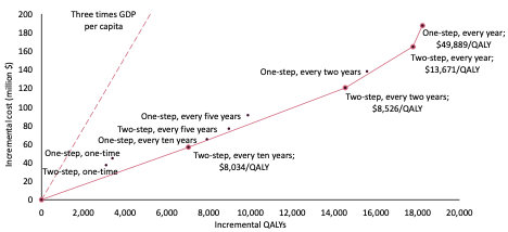 结果表明,提升筛查后的照护层径效果(从筛查到后续进行诊断测试的转化率,以及从确诊到接受治疗的转化率)可以进一步提高筛查策略的成本效益,进而减轻疾病带来的健康和经济负担。