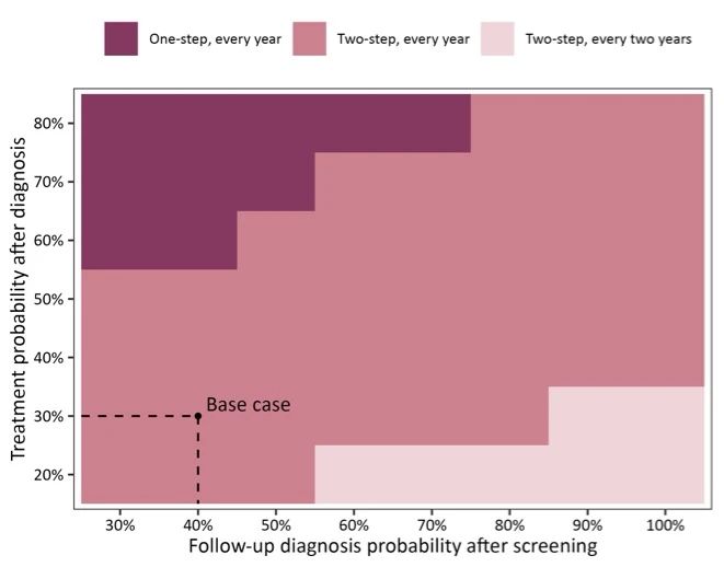 图4.在不同的照护层径情境下(不同后续进行诊断测试的概率,以及不同后续接受治疗的概率)所对应的最具成本效益的筛查策略