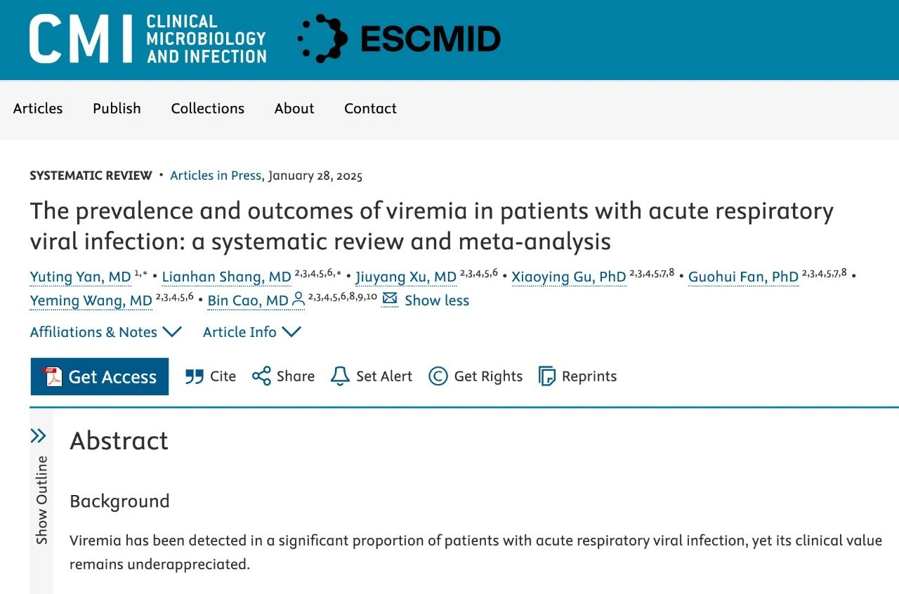 中国疾病预防控制中心2月6日发布的2025年第5周全国急性呼吸道传染病哨点监测显示第43周监测显示,门急诊流感样病例和住院严重急性呼吸道感染病例中流感均占比最高。流感重症病人死亡令人痛心,呼吸道感染预后成为公众和临床医师关注的焦点。呼吸道病毒感染是我们最常见的疾病之一,从普通感冒到流感,不少患者症状较轻,但部分病例可能会演变为危及生命的重症。为什么同样是呼吸道病毒感染,预后会存在如此大的差异?中日友好医院曹彬教授团队近期发表在《Clinical Microbiology and Infection》的研究“The prevalence and outcomes of viremia in patients with acute respiratory viral infection: a systematic review and meta-analysis”,系统总结了病毒血症在急性呼吸道病毒感染中的流行情况及其与临床预后的关系,为理解疾病进展提供了重要视角。