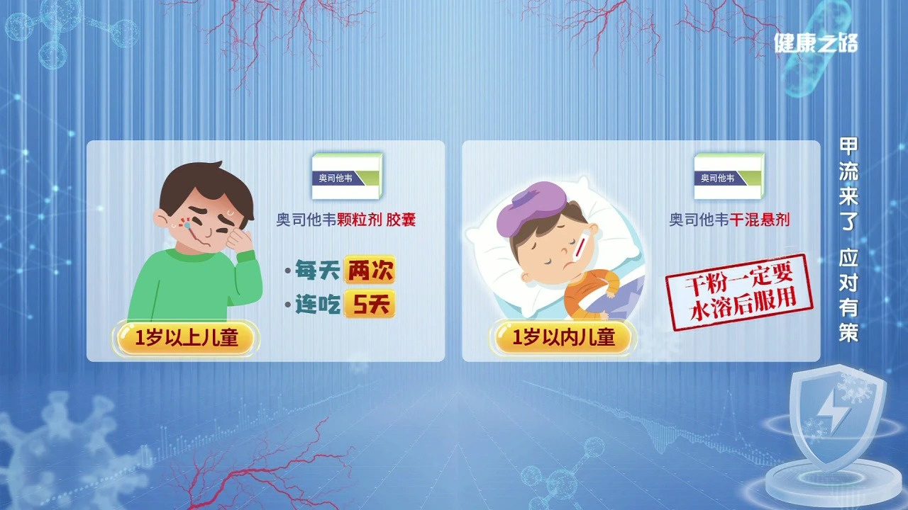 奥司他韦颗粒剂胶囊:适用于1岁以上儿童,根据体重计算剂量,每天2次,连吃5天。