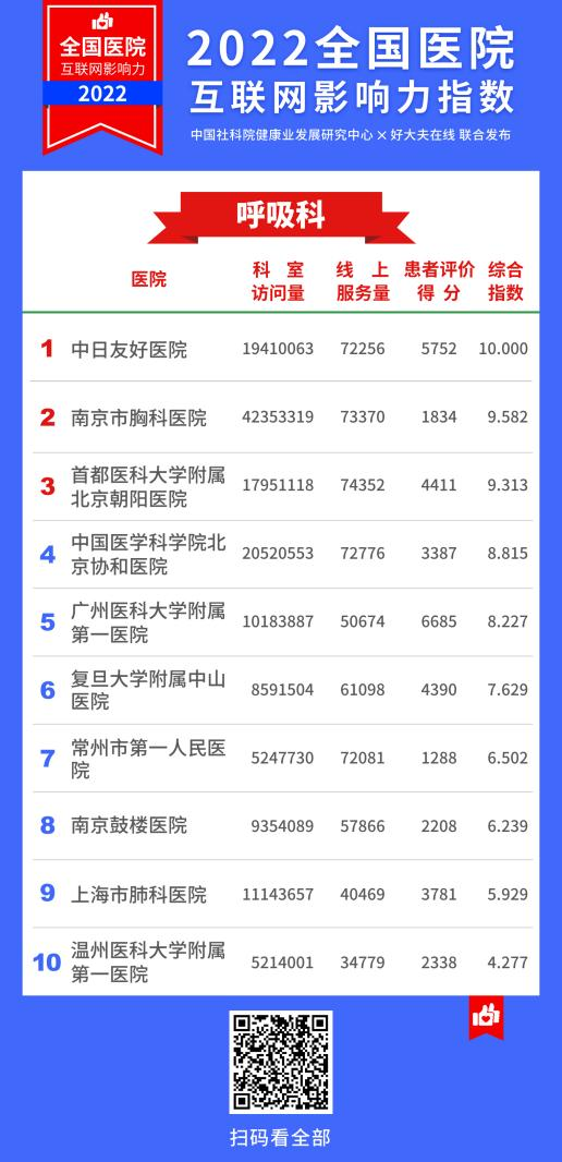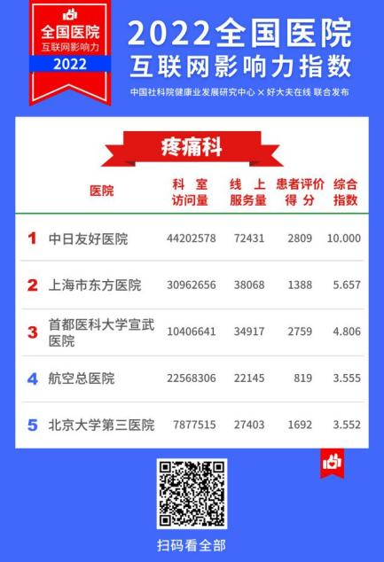 2022年11月26日,中国社科院健康业发展研究中心联合好大夫在线,发布“2022全国医院互联网影响力指数”,该指数的研究数据覆盖全国10317家公立医院,涉及36个专科。中日友好医院在五大专科领域名列前茅,呼吸科、疼痛科夺得学科魁首,皮肤性病科位居全国第六,普外科、肾病内科全国第七。