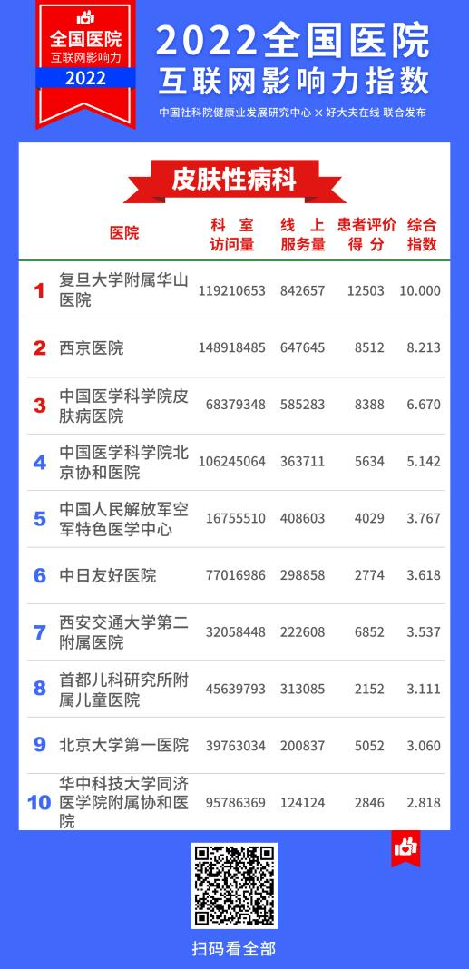 全国医院互联网影响力指数是全国首个基于海量患者真实行为数据进行的研究,中国社科院健康业发展研究中心基于主流互联网医疗平台「好大夫在线」16年来真实的医患行为数据,通过对657.7亿次患者浏览轨迹、8083万患者的互联网医疗服务记录、7.7亿次医患交流、583.9万条患者在医院就诊后的线上评价进行研究,得出2022年度36个专科领域患者线上线下就医选择的综合指数。