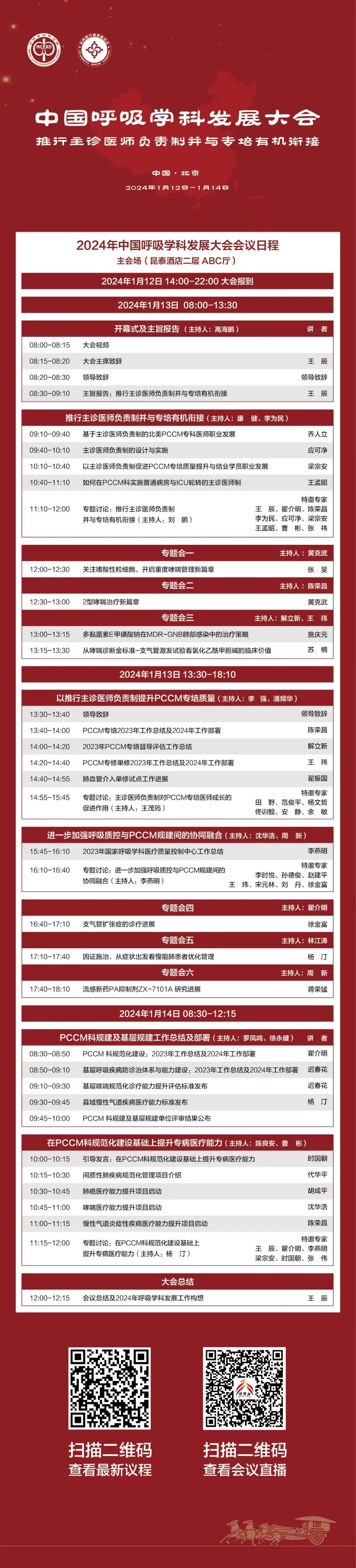 2024年1月13-14日,2024中国呼吸学科发展大会在京召开。全国呼吸界同仁在线上线下聚集一堂,共议中国呼吸学科发展大计。国家卫健委医政司司长焦雅辉、中国医师协会副会长齐学进、中日医院院长周军到会并致辞。本次大会主题为“推行主诊医师负责制并与专培有机衔接”。首日近9万呼吸人及医学界同行线上学习交流。