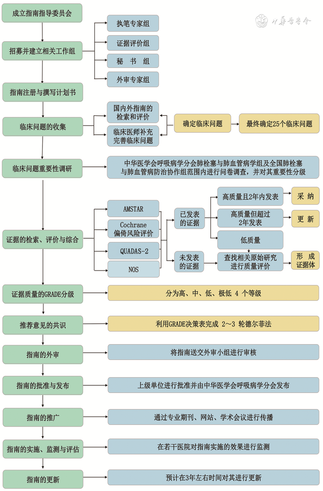 各部分初稿确定后,统稿专家组进行指南初稿整合。经统稿专家组审议通过后的指南初稿提交外审专家组进行审阅。根据外审专家组的反馈意见,执笔专家组对初稿进行修改,最后由指南专家组讨论批准指南的发布。