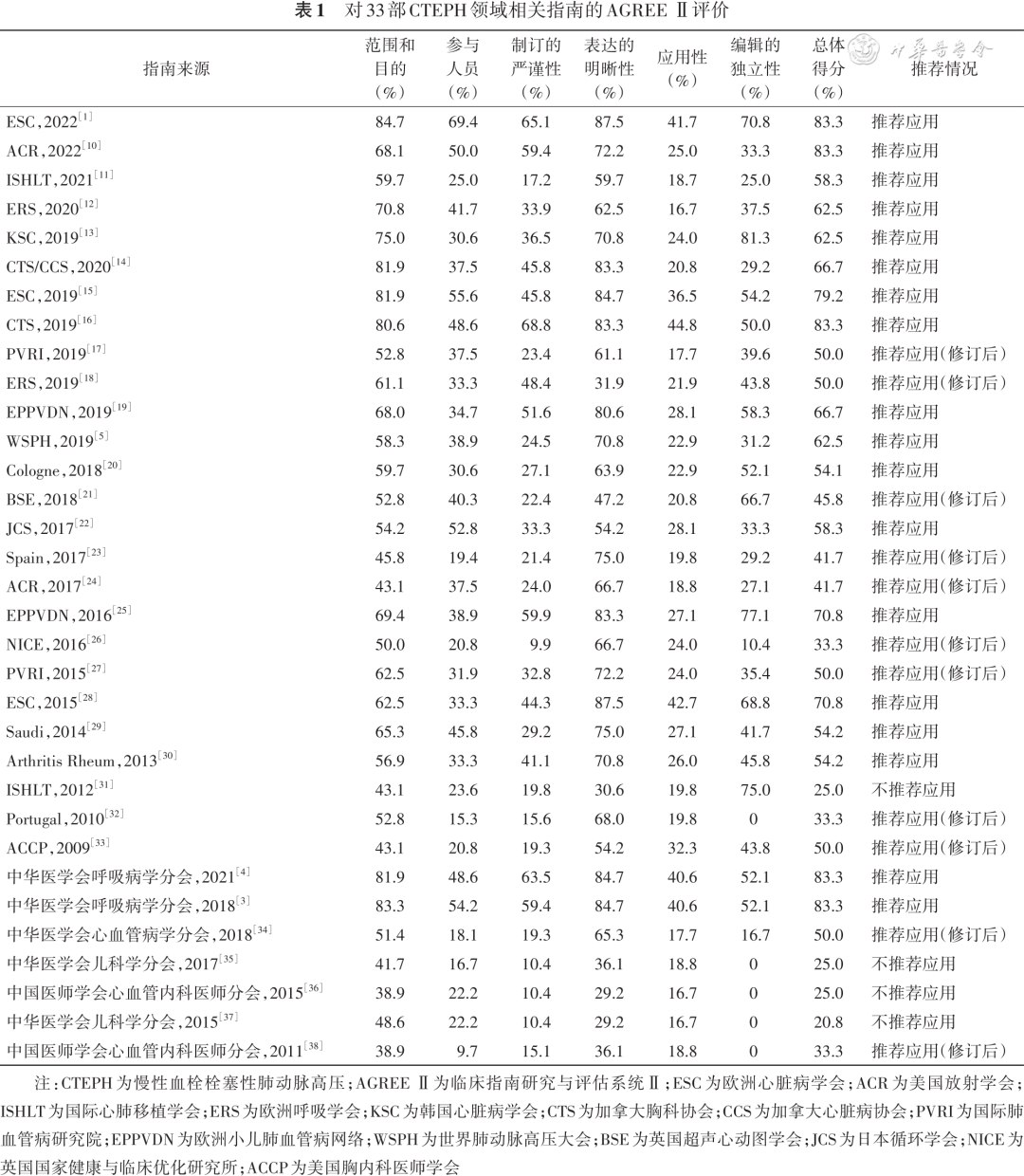 本指南小组应用AGREEⅡ对相关性比较高的指南进行评价。通过筛选,最终纳入指南33部,其中英文指南26部,中文指南7部。4名研究人员应用AGREEⅡ对纳入指南独立进行评价,预试验结果显示4名研究人员对评分条目的理解一致性较好。经过评价每部指南各领域的得分情况,对每部指南是否推荐使用的结果显示,18部(54.5%)指南被推荐使用,11部(33.3%)被推荐修订后使用,4部(12.1%)不推荐使用(表1)。