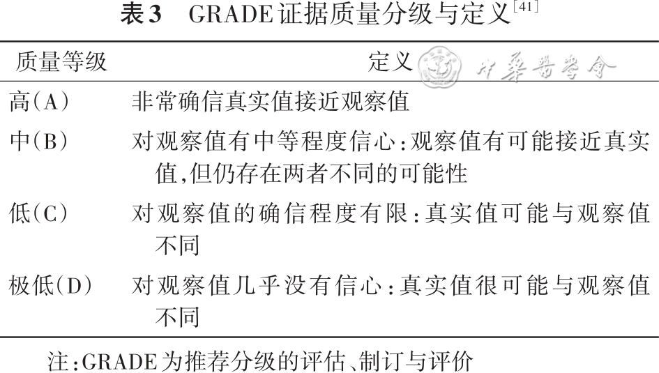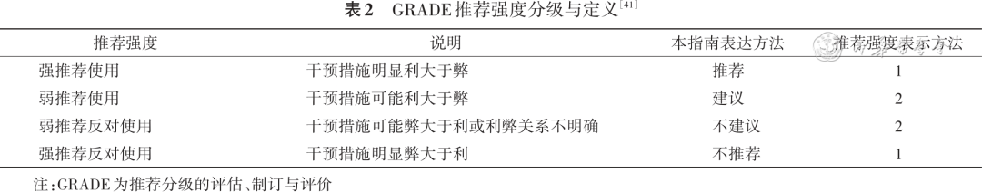 证据和推荐意见分级采用推荐分级的评估、制订与评价(GradingofRecommendationsAssessment,DevelopmentandEvaluation,GRADE)分级系统(表2、3)[43],由兰州大学循证医学中心/GRADE兰州大学中心和北京大学公共卫生学院提供方法学支持。