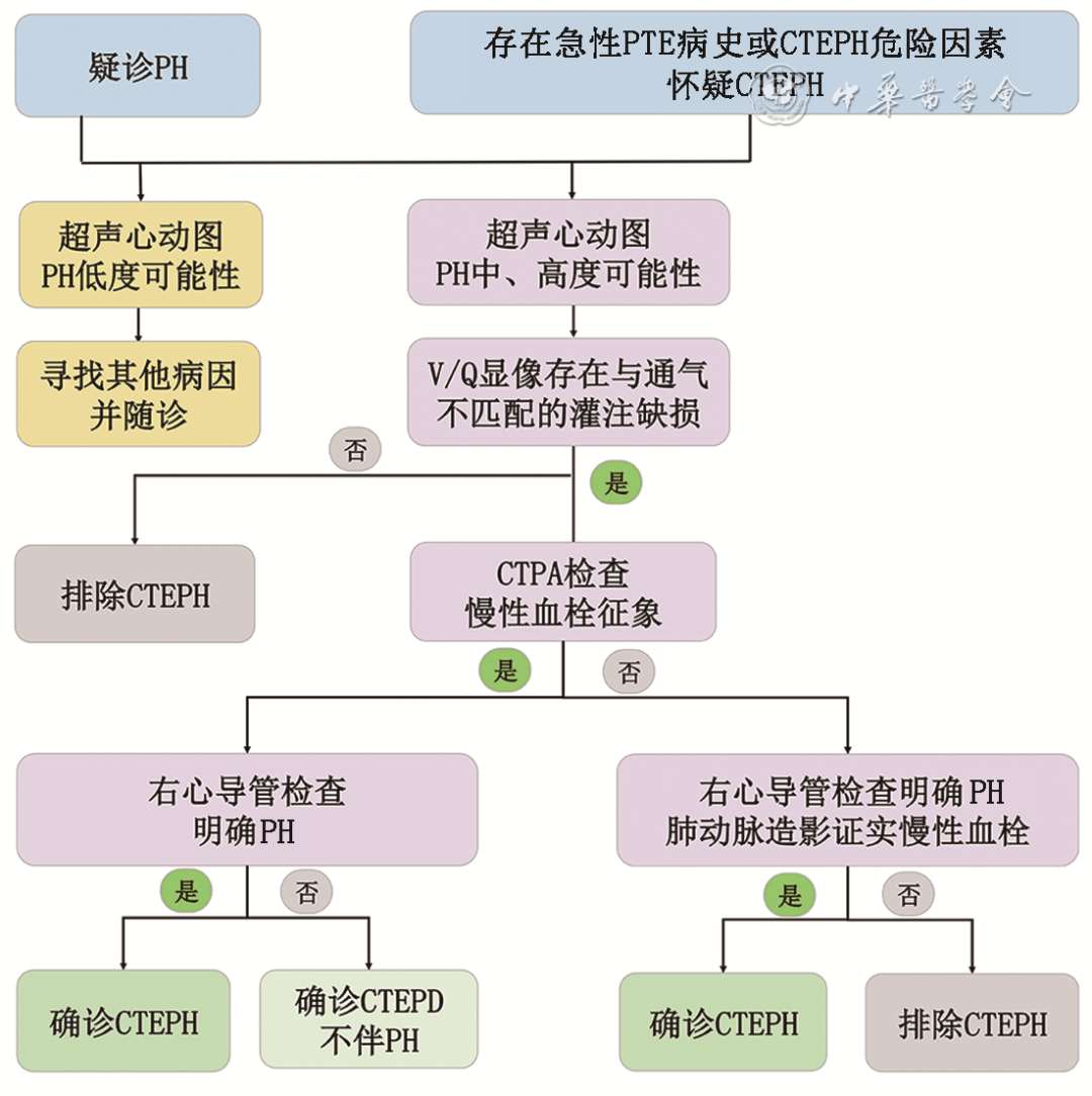 对于有急性PTE或深静脉血栓形成(DVT)病史的患者,如充分抗凝治疗3个月后仍然存在活动后呼吸困难等症状,应筛查CTEPH,建议行超声心动图筛查,如超声心动图为PH中度或高度可能性,则应进一步进行确诊检查[包括CTPA和(或)V/Q显像、RHC及肺动脉造影]以明确CTEPH的诊断;即使无任何症状,如急性PTE患者存在CTEPH危险因素,也建议在抗凝治疗期间密切随访,早期识别CTEPH。