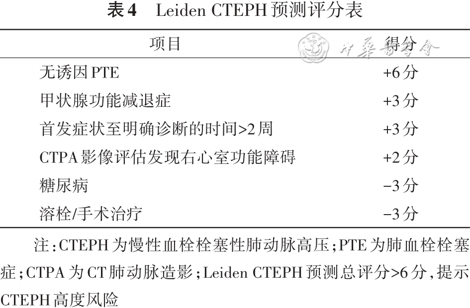 国际上曾提出CTEPH风险评估模型(LeidenCTEPH预测标准)[87],见表4,总评分>6分,提示CTEPH高度风险。有资料显示,LeidenCTEPH标准预测CTEPH的灵敏度和特异度分别为85%~91%和75%。CTEPH预测评分>6分或有与CTEPH相关症状的患者接受CTEPH排除标准筛查,即评估NT-proBNP是否异常和(或)心电图特征是否存在右心室负荷心电图特征(右束支传导阻滞;V1导联R:S>1伴有R>0.5mV;QRS电轴向右偏移),如果存在至少一条排除标准异常,则建议行超声心动图筛查。CTEPH预测标准联合排除标准[88,89],使诊断CTEPH的灵敏度提高至91%,可重复性达96%。