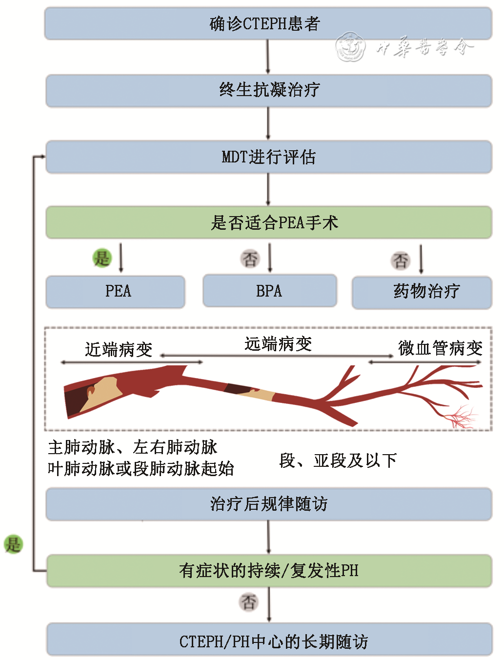 推荐意见说明:对于所有明确的CTEPH患者,均推荐有经验的医学中心进行PEA手术评估,但是由于手术经验的差异,不同中心对于PEA手术的决策会受到客观条件的影响,因此,对于部分患者,可以到更有经验的中心进行再评价。