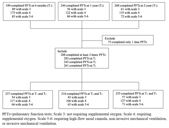 研究对象:在连续的随访情况中,6个月时为2020.6.16-2020.9.3,349例完成随访;1年随访时为2020.12.16-2021.2.7,244例完成随访;2年随访时为2021.11.16-2022.1.10,268例完成随访。最终,288名完成至少2次肺功能检查的COVID-19康复者纳入最终分析。