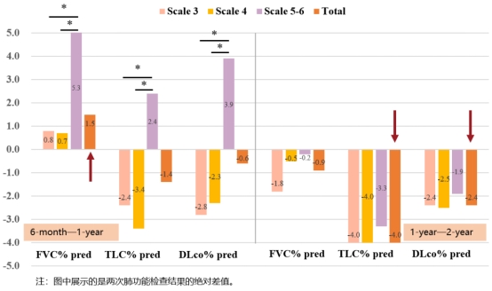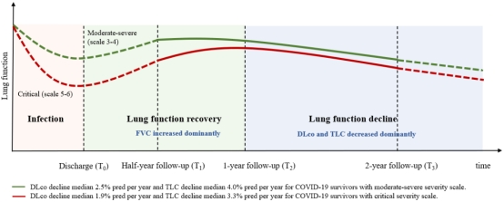 从肺功能的变化来看,感染原始株的COVID-19康复者肺功能的恢复大致可以分成两个阶段。第一个阶段是出院后6个月至1年,不同疾病严重程度康复者总体上FVC呈好转趋势,而TLC、DLco呈下降趋势;3分、4分组康复者肺功能变化总体趋势一致,且5-6分组康复者的FVC、TLC、DLco均呈好转趋势,肺功能的恢复程度显著高于3、4分组;但在更长的随访周期里,即出院后1至2年的第二个阶段,无论初始疾病严重程度如何,康复者肺功能总体呈下降趋势且未见组间差异。