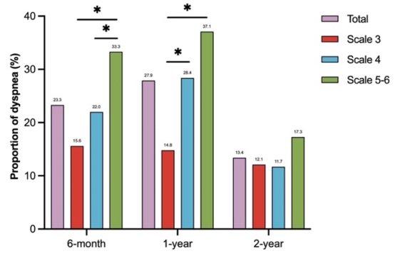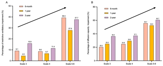 LongCOVID的发生率在出院后2年(62.5%)较出院后6个月(69.1%)下降,较出院后1年(57.6%)升高;而限制性通气功能障碍和肺弥散功能下降的比例则随时间逐渐升高;另外,重症的COVID-19康复者发生肺功能异常的比例更高,均与研究队列整体变化趋势一致。