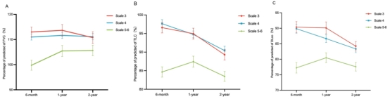 从下图可以看到,3、4分组康复者的肺功能变化趋势大致相同,FVC%pred在出院后6个月至1年中,轻度提升后出现下降,而TLC%pred和DLco%pred整体呈下降趋势。5-6分组康复者肺功能在出院后6个月至1年提升后转为下降趋势,且肺功能水平持续低于3、4分组康复者。出院1年后,不同疾病严重程度康复者均出现以TLC%pred和DLco%pred为主的肺功能下降趋势。
