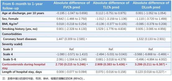 我们也对肺功能变化的影响因素进行了分析,发现住院期间使用激素治疗是出院后6个月至1年肺功能好转的独立保护因素;但未见对出院后1年至2年肺功能下降的独立影响因素。