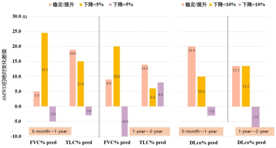 肺功能稳定或提升:两次肺功能检查结果间,FVC,TLC和DLco实测值占预计值百分比的差值≥0;