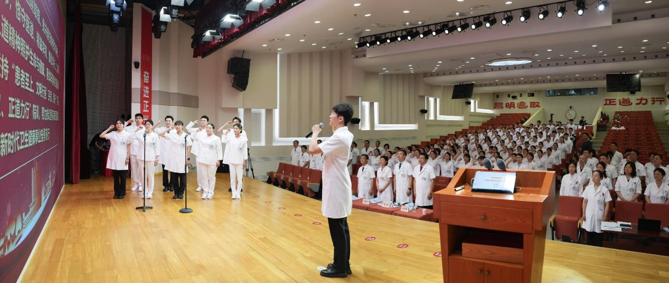 2025年8月4日,中日友好医院举行了2025年新职工入职仪式。仪式在回顾医院四十年发展历程的宣传片中拉开帷幕。全国名中医史载祥教授和护理专家蔡增云老护士长为新职工代表授予镌刻着“患者至上、文明行医”及辛育龄老院长签名落款的胸牌。全体新职工以铿锵誓言,许下赓续辛育龄红医精神、为新时代卫生健康事业奋勇前行的坚定承诺。院领导以及临床医技科室和职能部门负责人代表出席仪式并监誓。