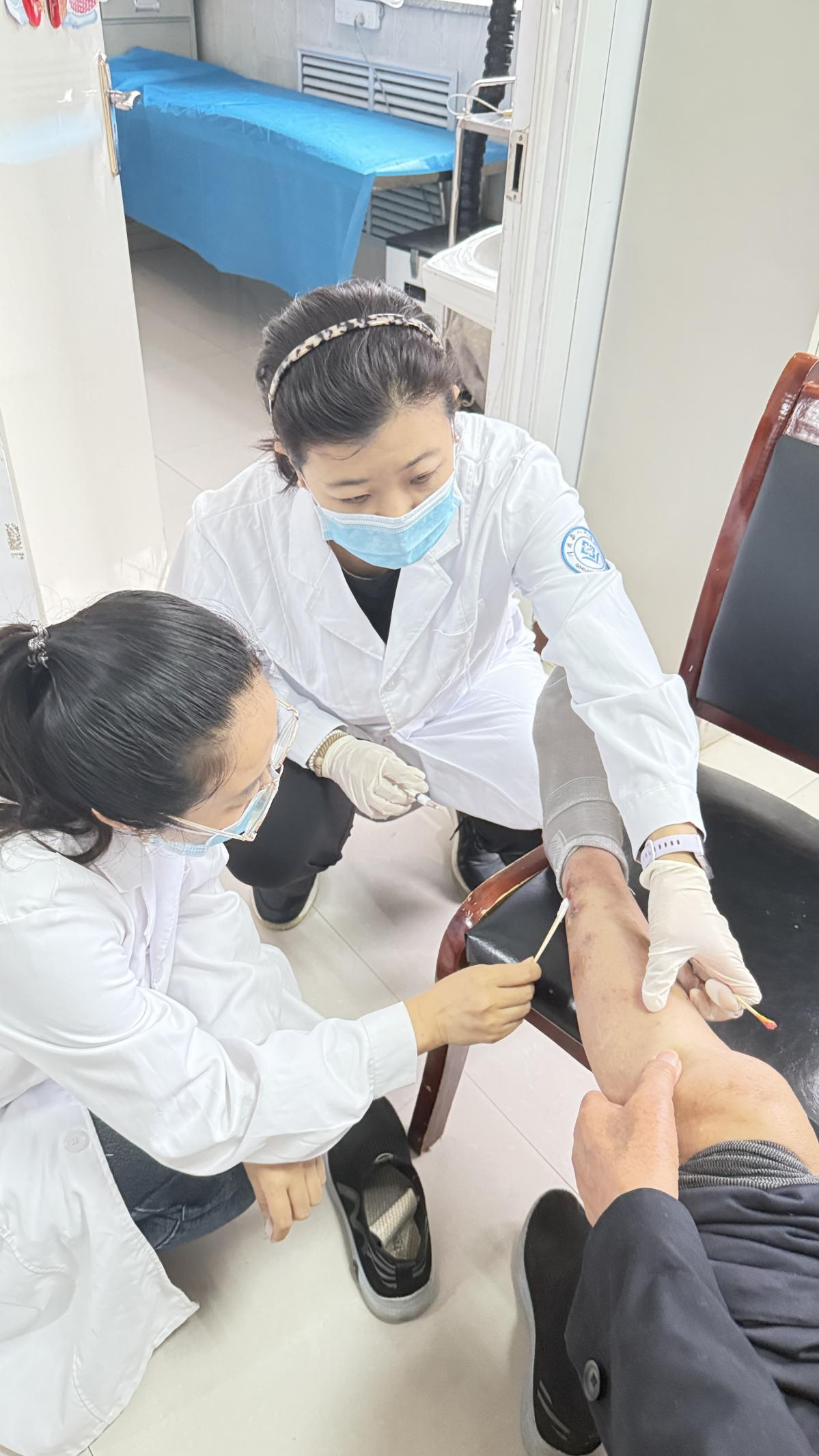 医疗队副队长、皮肤科副主任医师李锘指导皮肤科开展病损封闭注射新技术,为一位92岁结节性痒疹患者进行曲安奈德皮损内注射治疗