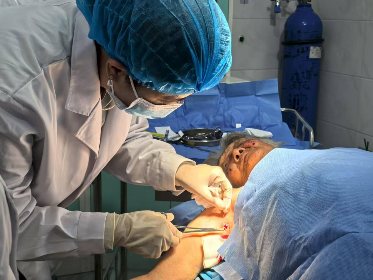 门诊之余,副队长李锘还为一位95岁的老人开展了局麻下的大疱性天疱疮活检手术。老奶奶存在认知障碍,与医护人员沟通困难,肢体配合度较差。李锘耐心安抚老人情绪,凭借娴熟技术顺利完成手术,并当地医生介绍了活检手术的操作要点。