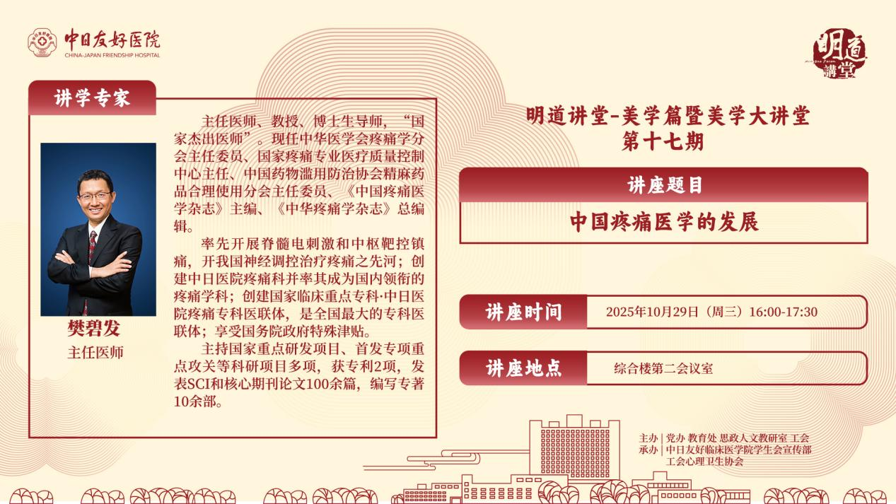 2025年10月29日,中日友好医院“明道讲堂美学篇”暨“美学大讲堂”第十七期专题讲座在综合楼第二会议室举办。本期讲座特邀中华医学会疼痛学分会主任委员、国家疼痛专业医疗质量控制中心主任、中日友好医院疼痛科主任樊碧发教授,以“中国疼痛医学的发展”为题作专题报告。中日友好医院党委常委、总会计师齐剑锋致辞并为樊碧发主任颁发纪念证书,讲座由国家优秀青年医师、风湿免疫科副主任舒晓明主持。