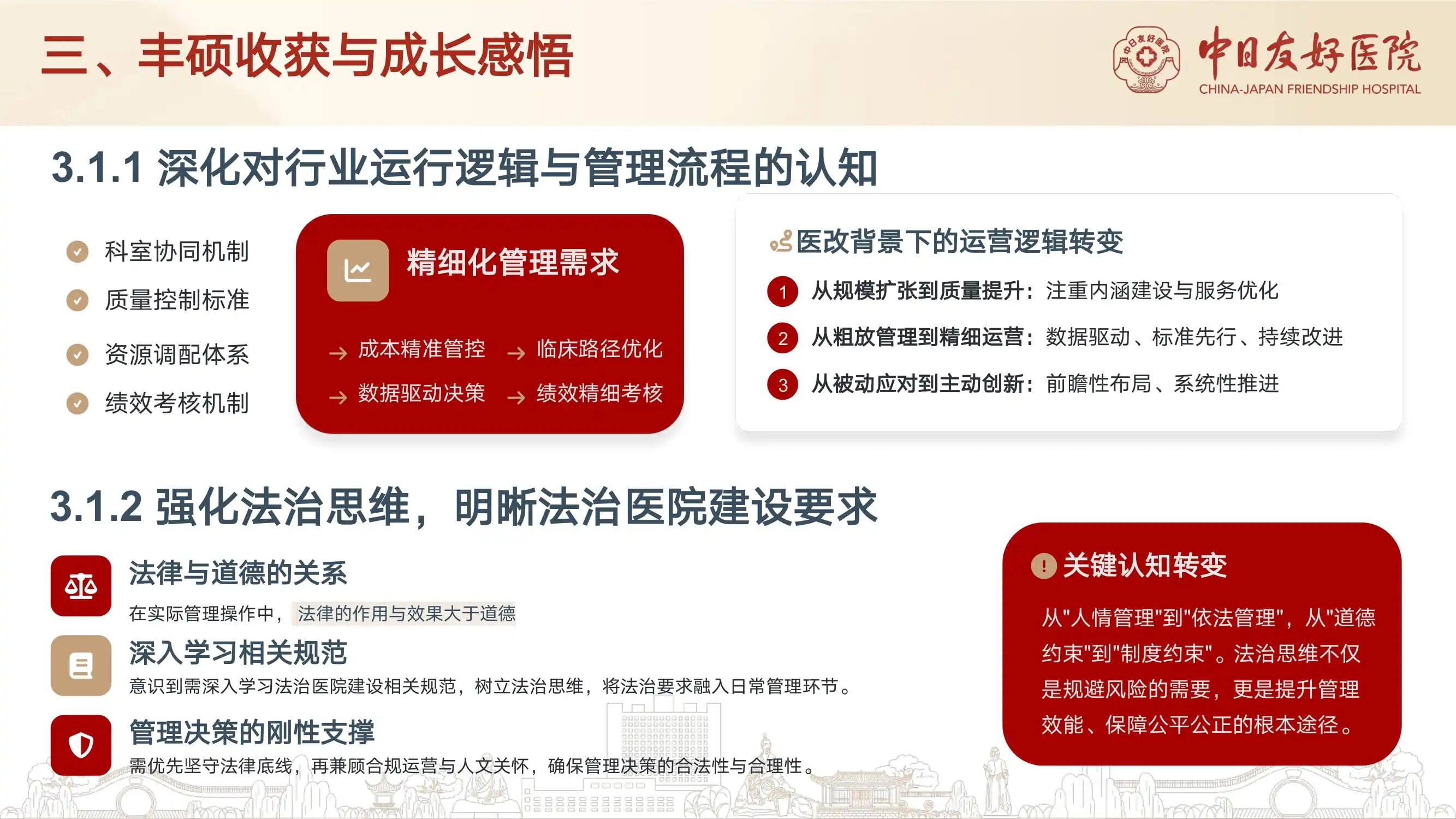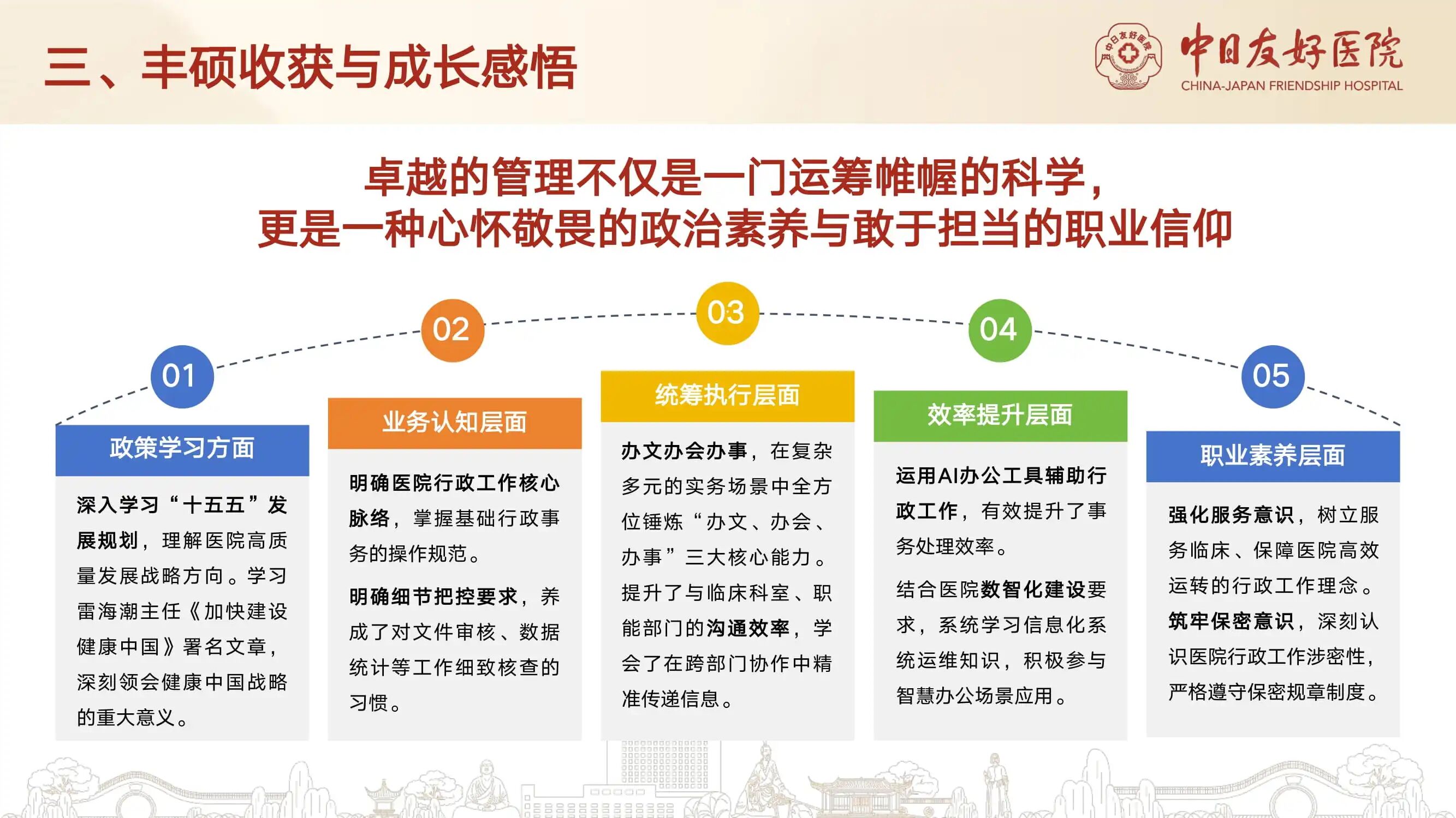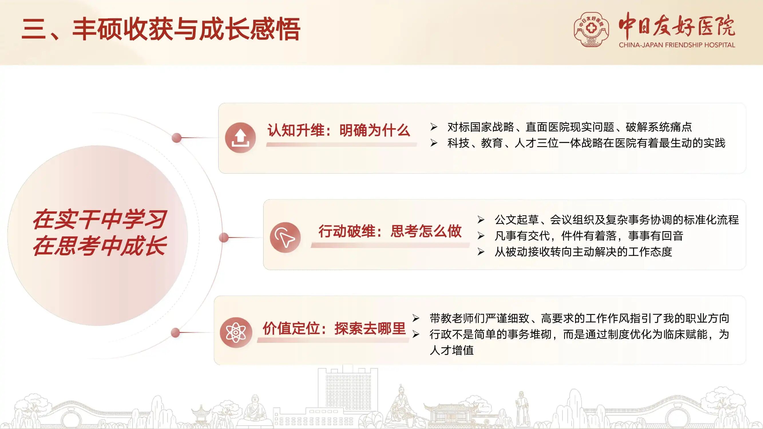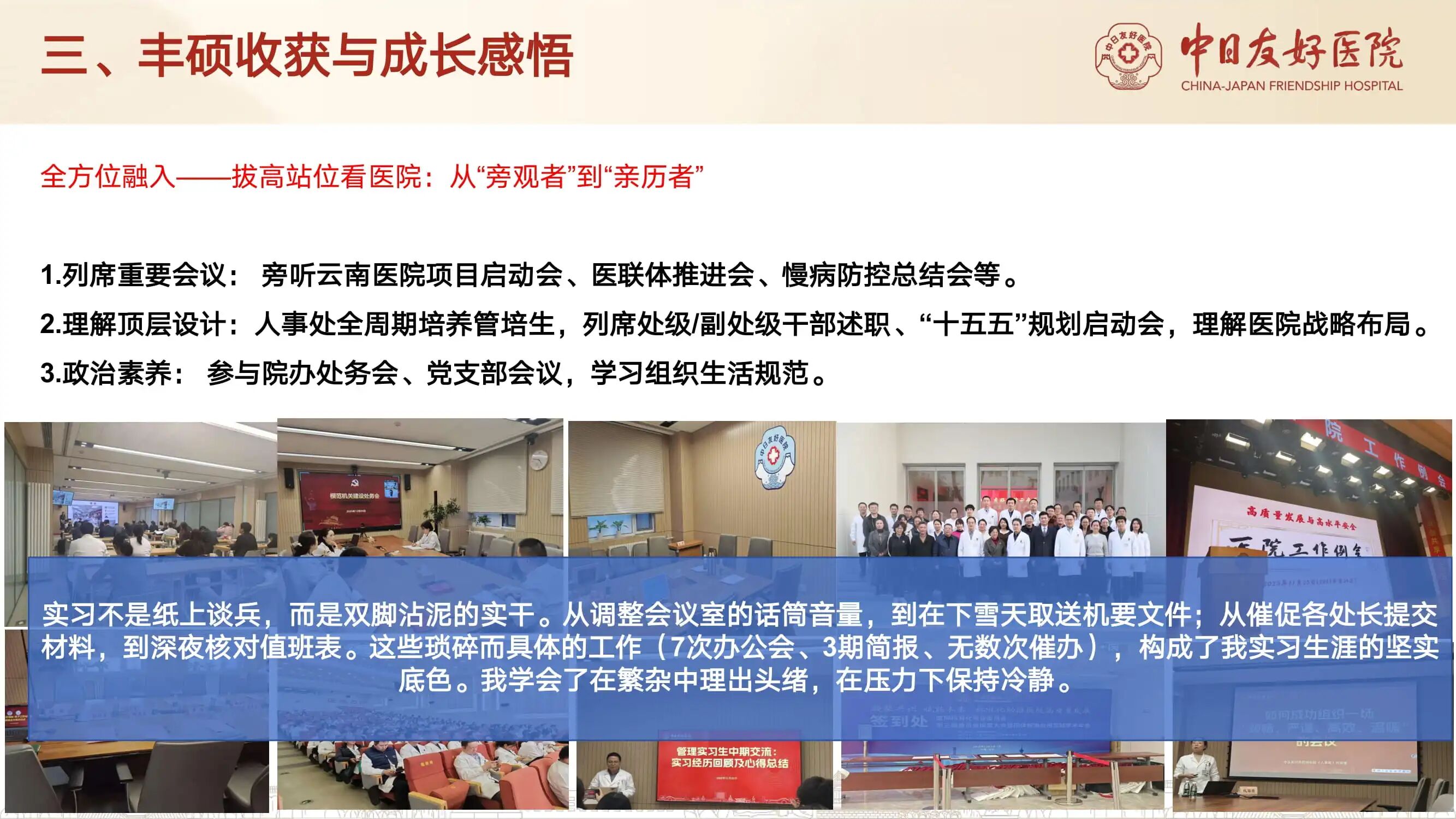 带教老师们精湛的业务能力与务实严谨的工作态度,更在实习生心中种下了坚守初心的种子。“老师们‘不浮躁、不守旧、不离实’的工作准则,让我们懂得医院管理既要仰望星空,更要脚踏实地。”字里行间透露出培训中的满满收获,表达了对医院与老师们的感恩,更流露着对这段成长旅程的不舍之情。
