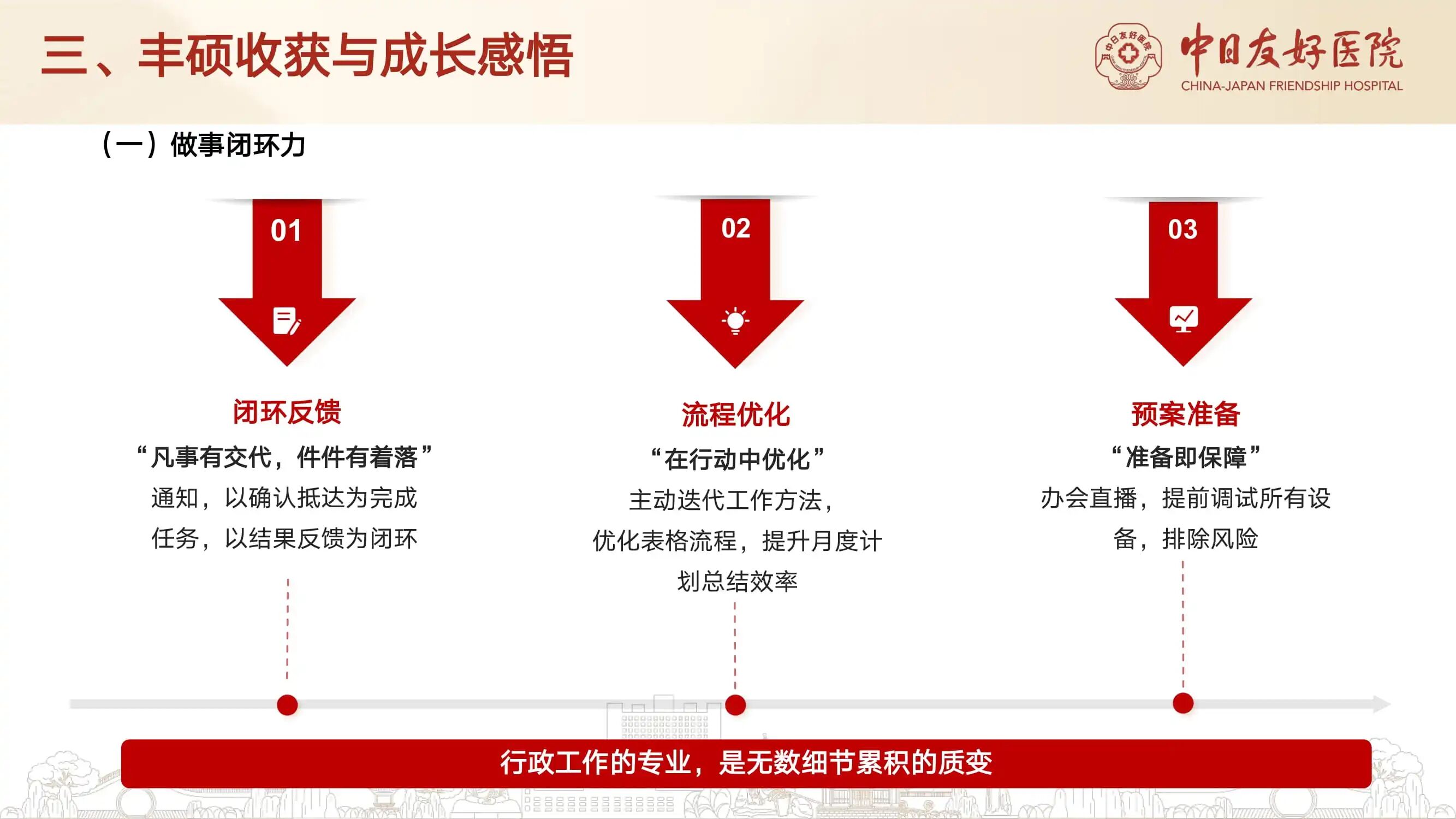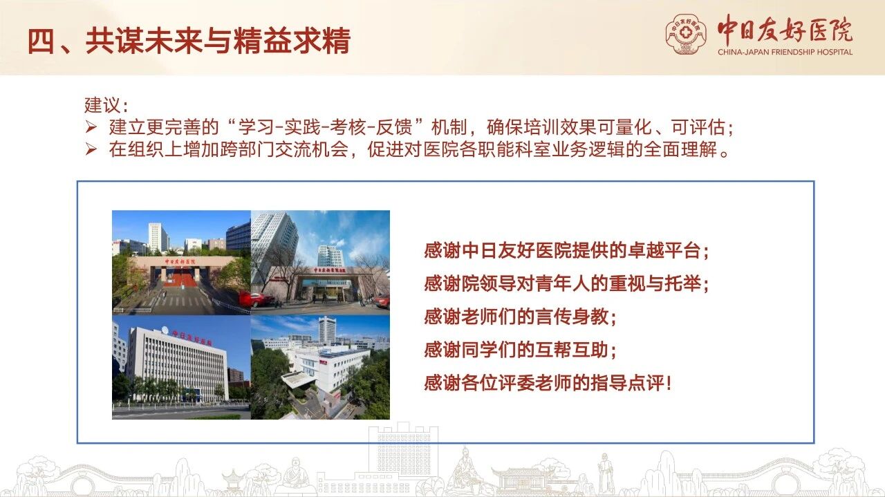 崔勇副院长(主持医院行政工作)对同学们的结业展示进行了逐一点评,对同学们的精心准备和精彩展示予以充分肯定,并表示:经过规范化培训,同学们实现了自“从动者”向“主动者”的转变。自信源自专注、专业和努力,希望各位同学持续巩固提升实干能力、总结归纳能力和表达能力,善于思考、勇于创新,注重从新知新见中总结凝炼提升,更好的投身管理实践,为卫生健康事业贡献智慧与力量。