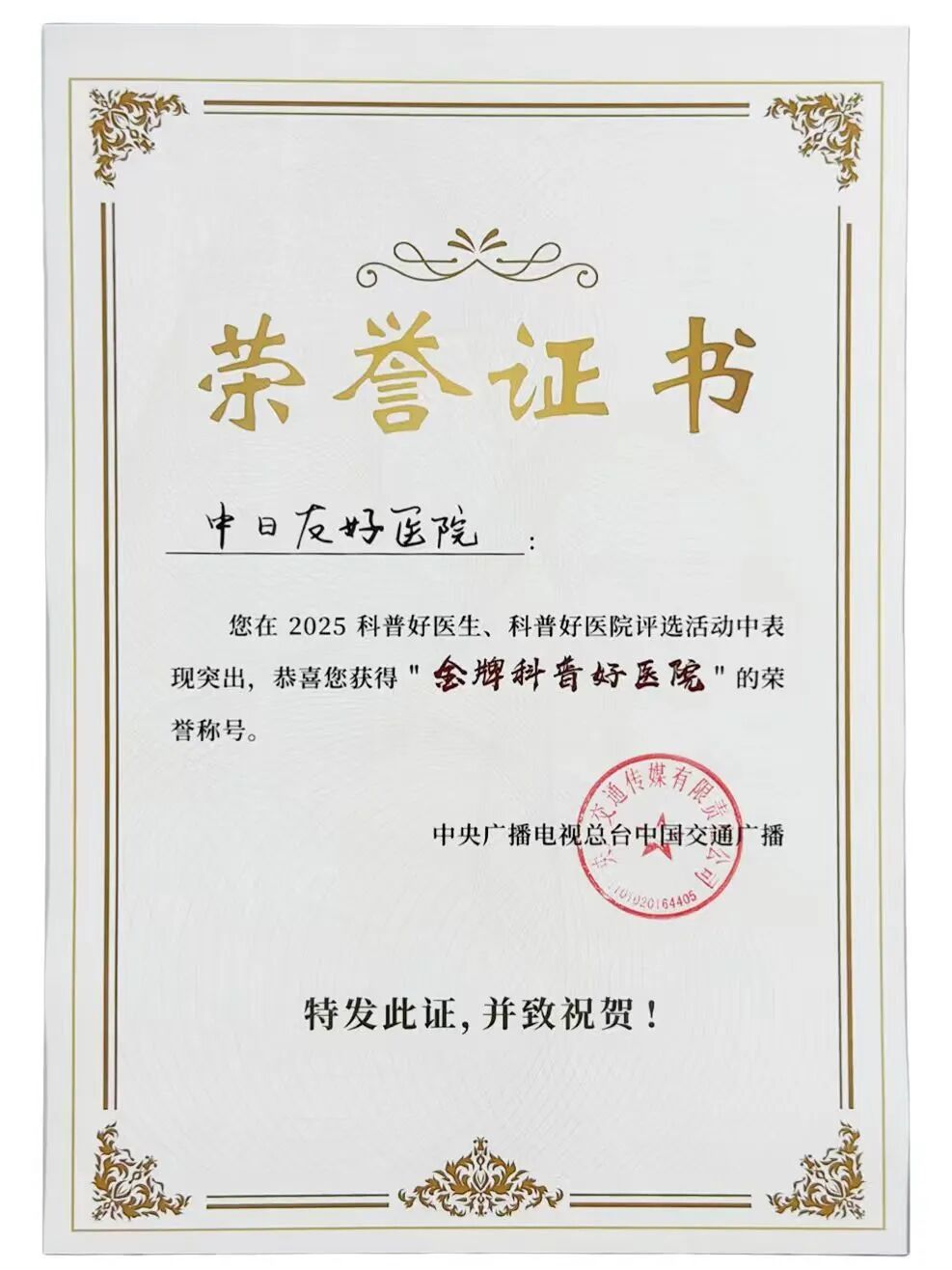 近日,“2025科普好医生、科普好医院”主题发布活动在北京举行。中日友好医院获“金牌科普好医院”“银牌科普好医生”奖项。