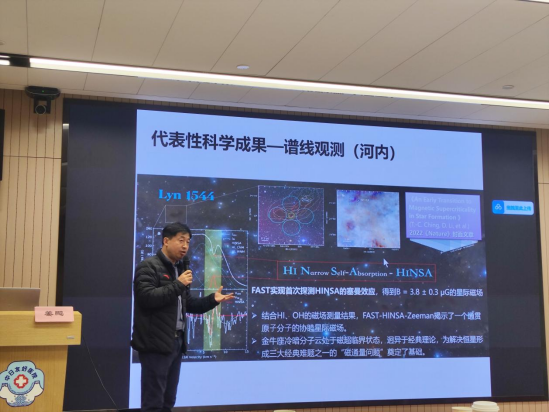 讲座伊始,姜鹏老师从人类对天文的兴趣开始,旁征博引地讲述了射电天文学的由来及发展历程,并深入浅出地阐释了天文学中观测能力的重要指标,即灵敏度和分辨率,及其影响因素。在讲解了上述基础原理后,姜鹏老师分享了500米口径球面射电望远镜(FAST)的设计历程。作为世界上最大的单口径射电望远镜,FAST的建设历程充满了坎坷、探索与突破。钢索的强度与耐疲劳性、信号的定位精度、条件艰苦的工作环境……都是摆在姜鹏老师及其研究团队面前的一道道难题,但他们没有因畏难而退缩,而是锲而不舍、反复求索,终于经历了近百次失败后自主研发出了具有超高耐疲劳性能的新型钢索并用近7000根钢索构建起了为FAST量身定制的世界上跨度最大、精度最高、工作方式最特殊的索网工程。