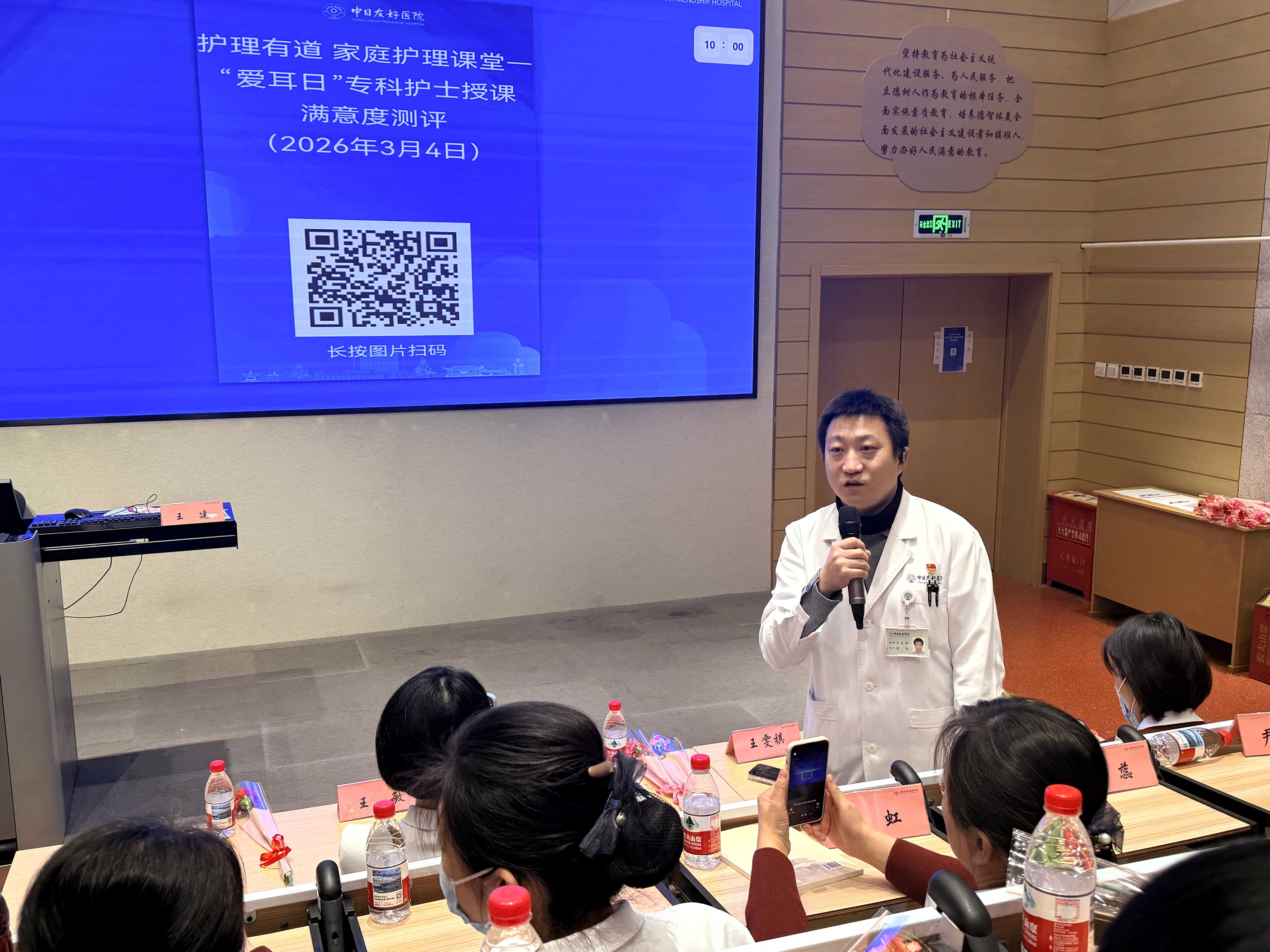 2026年3月4日,护理部“护理有道·家庭照护课堂”系列讲座正式启动。本期讲座由护理部行风文化组与专科建设组联合策划。在第27个全国爱耳日来临之际,来自耳鼻喉科的护理团队为广大患者和家属带来了“安全用耳·健康成长”的专题讲座。旨在提升患者家属的居家照护能力,构建医护与家庭协同的健康支持体系。此次讲座吸引了近百名患者及家属参与。护理部孙育红副主任,团委王雯祺副书记参加了本次活动并致辞。
