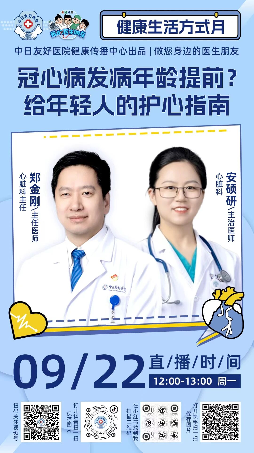 2025年9月22日(星期一)12:00-13:00,世界心脏日即将来临之际,中日友好医院《我的医生朋友》健康科普直播间,心脏科特别健康科普企划——《冠心病发病年龄提前?给年轻人的护心指南》