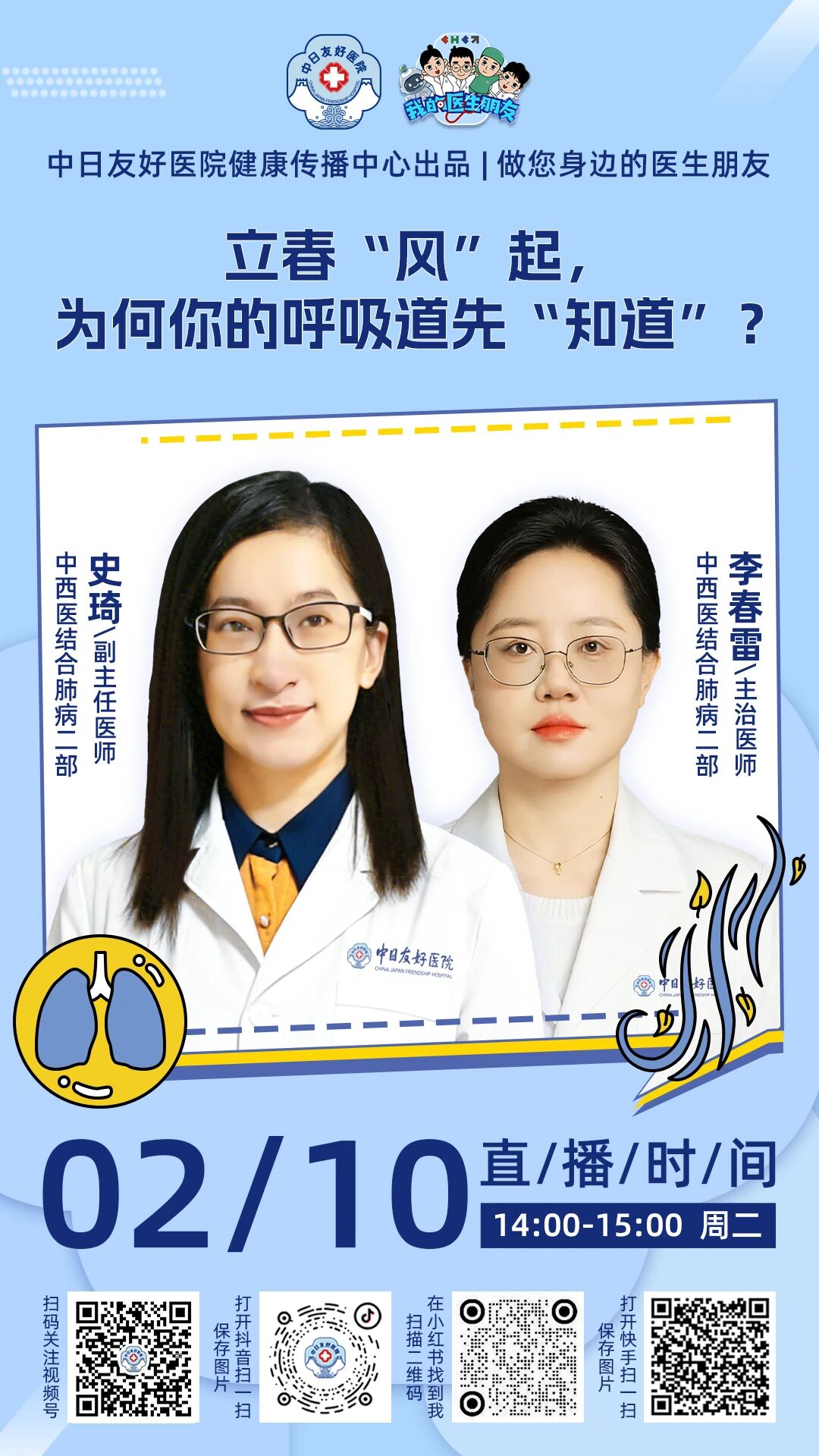 2月10日14:00-15:00,中日友好医院中西医结合肺病科专家,带你读懂春风背后的“呼吸密码”,让你“防咳喘于未然”,掌握咳喘防与治的主动权!