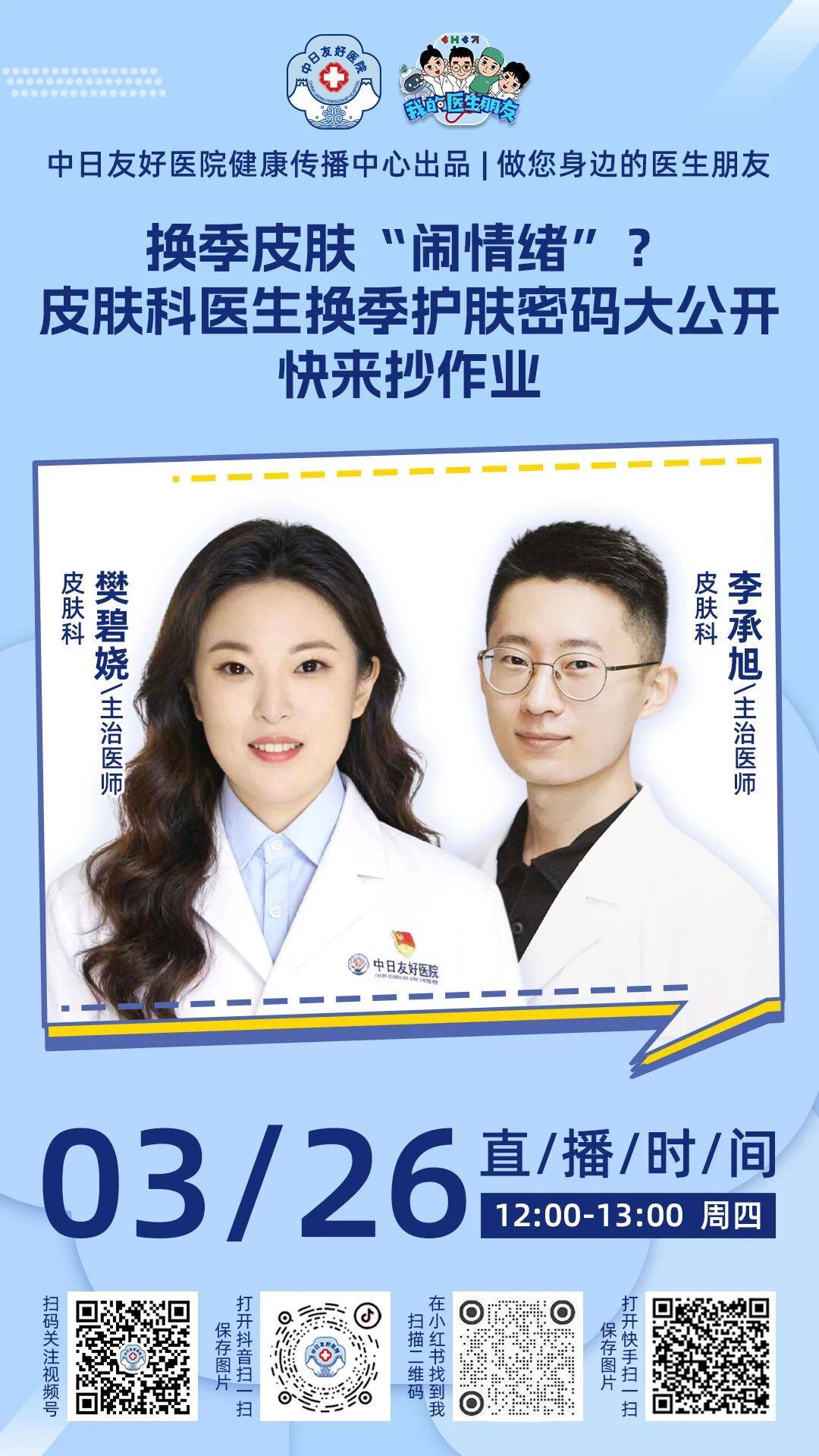 2026年3月26日中午12:00-13:00,中日友好医院《我的医生朋友》官方直播间,皮肤科李承旭、樊碧娆医生聚焦春季过敏性皮肤病高发问题,为您带来护肤密码!