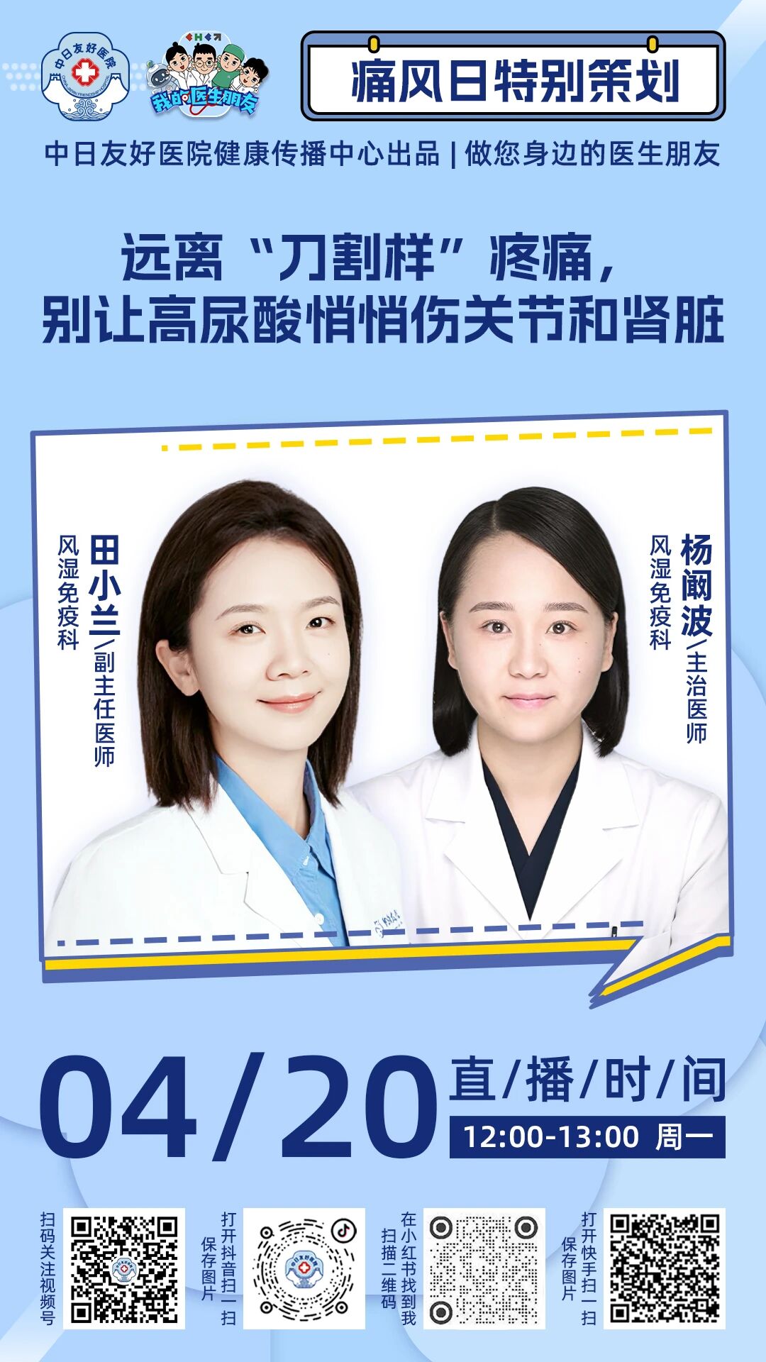 4月20日12:00-13:00,中日友好医院风湿免疫科专家坐镇直播间,为您系统讲清高尿酸与痛风的“防、治、管”——