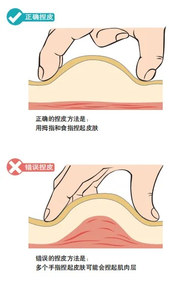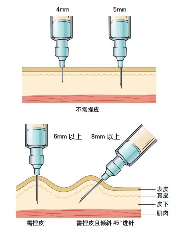 患者若使用4mm和5mm针头,一般无须捏皮,即使是垂直进针,发生肌内注射的风险也比较小(4mm针头最安全,适合成人和儿童使用,可以不分年龄、性别和体质指数BMI)。患者若使用6mm针头注射时需要捏皮,以免误将药液注射到肌肉层,从而导致低血糖的发生。