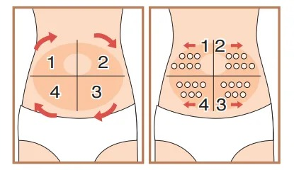 以腹部为例,将腹部分为4个象限,每个象限中一个注射点与另一个注射点间隔1厘米,我们可以用一个手指间隔每个注射点的距离,避免在同一位置注射胰岛素(见下图)。