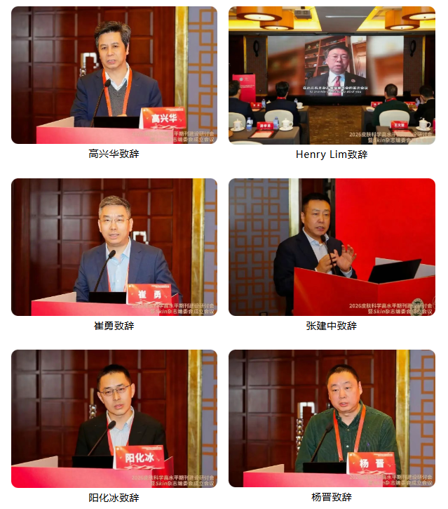 高兴华、HenryLim、崔勇、张建中、阳化冰、杨晋先后致辞,并表示在国家不断加大对皮肤科学领域的支持,以及加快推进世界一流科技期刊建设的大背景下,Skin杂志的创办恰逢其时,作为国内为数不多的皮肤科学英文期刊,不仅体现了时代需求,更是承载着汇集学术成果,推动学科发展的重要使命,杂志的推出为“十五五”期间学科建设提供了有力支撑,具有里程碑式的意义。要努力搭建优质的国际学术交流平台,让国内皮肤科学领域专家把论文写在祖国大地上,向世界传播中国声音。编委会要深入学习贯彻习近平总书记在全国“两会”期间关于健康中国建设重要讲话精神,认真落实雷海潮主任对期刊建设工作指示,筑牢质量根基,加强规范管理,推动国际传播,早日跻身世界一流科技期刊行列。