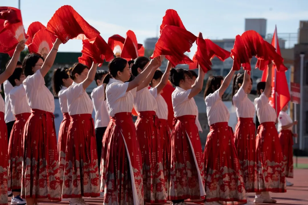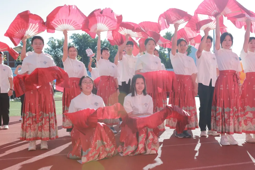 紧接着,我院队员们带来了精彩的扇子舞表演。伴随着悠扬深情的背景音乐《万疆》,表演者们手持红色扇子,整齐划一地挥舞,动作优美而有力。这段刚柔并济的扇子舞不仅展示了我院师生的艺术修养与活力,还为入场式增添了一抹别具特色的亮点。