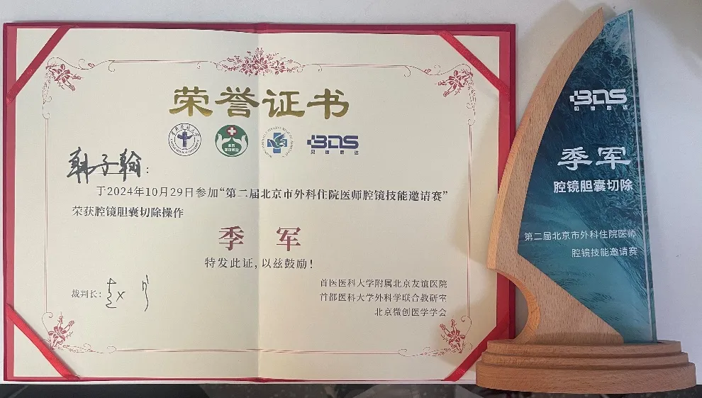 (图3 普外科·结直肠外科韩子翰荣获第二届北京市外科住院医师腔镜技能比赛腔镜胆囊切除操作单项季军)