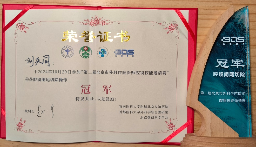 (图2 普外科·肝胆胰外科二部刘天同荣获第二届北京市外科住院医师腔镜技能比赛阑尾切除操作单项冠军)