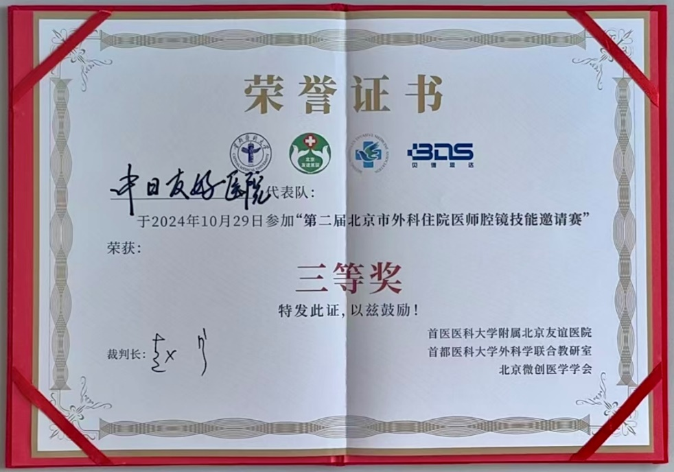 我院代表队由普外科·肝胆胰外科二部住院医师刘天同(2023级外科专业住院医师规范化培训学员)和普外科·结直肠外科住院医师韩子翰(2022级外科专业住院医师规范化培训学员)组成,指导教师为普外科·肝胆胰外科二部司爽、胸外科温焕舜和泌尿外科曹传振,司爽老师担任领队。经过激烈的角逐,刘天同荣获腔镜阑尾切除操作单项冠军(图2)、韩子翰荣获腔镜胆囊切除操作单项季军(图3),我院代表队荣获三等奖(图4)。