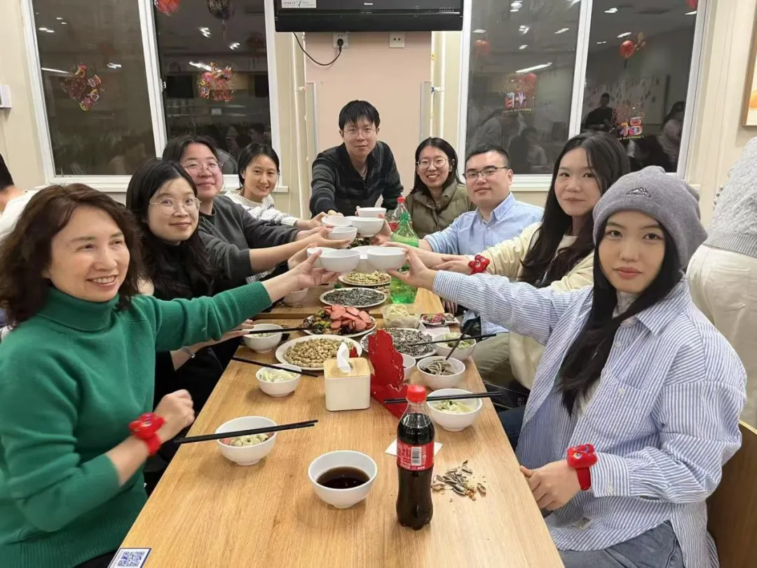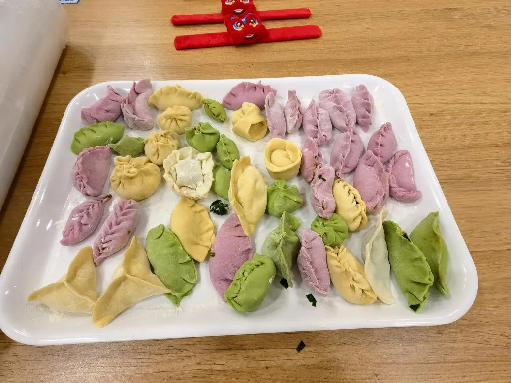 师生齐聚一堂,热火朝天地开始包饺子。活动分成6组,分别从饺子的创意、数量、规整度等方面进行评比。大家有的切面、有的擀皮、有的包馅、有的现场教学。其乐融融,笑语迭起。不一会儿,大大小小、各式各样、五颜六色的饺子就摆满了托盘。热火朝天,欢声笑语。现场师生边吃着热气腾腾的饺子,边聊着家乡的小年习俗。现场还有击鼓传花、写福祈福、随机送祝福等丰富多样的活动。现场空气中弥漫着幸福的年味、饺子的香气,一片其乐融融、欢声笑语的美好景象。