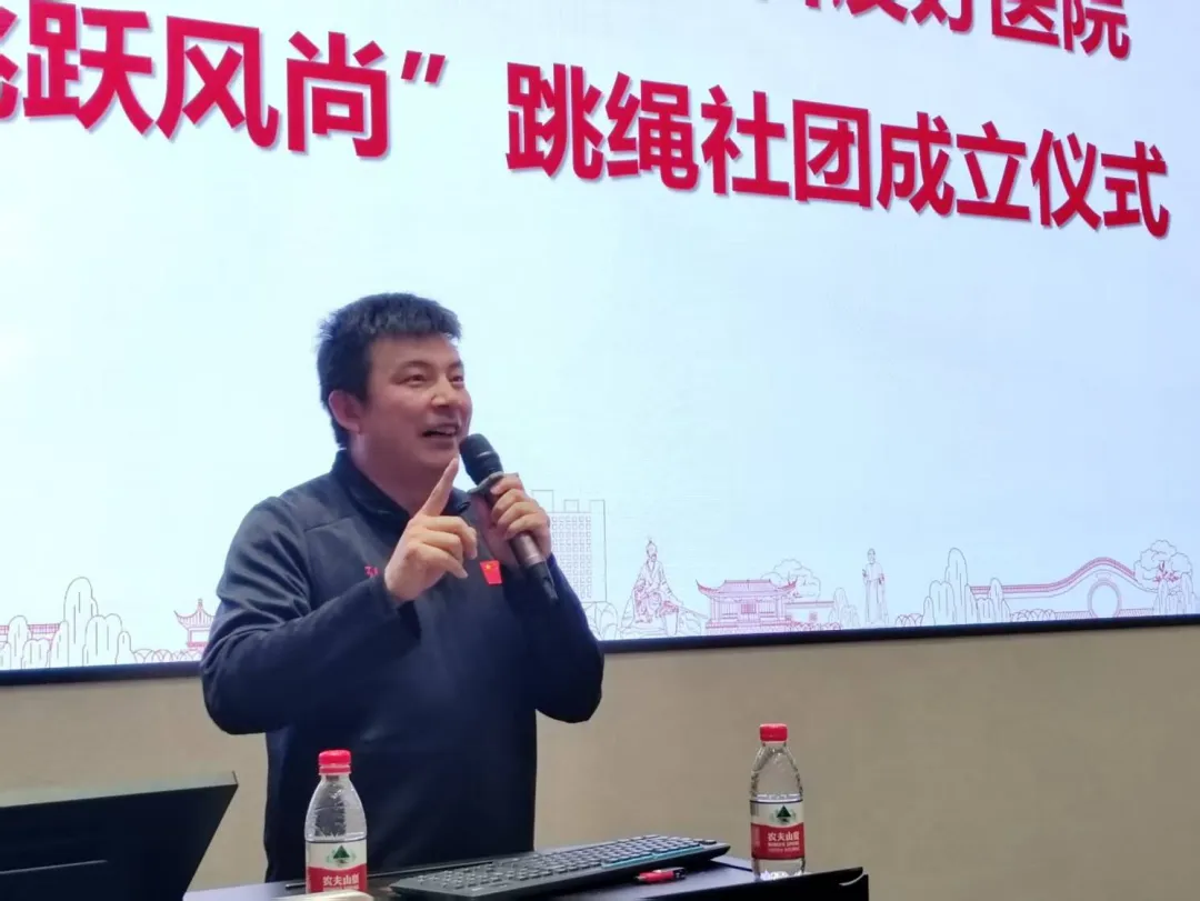 接着,作为减重中心科的杨磊老师生动为大家分享了一堂关于运动与体重的心得和体会。他通俗易懂地讲述了运动、饮食及体重三者之间的关系,在场的老师和同学们受益匪浅。并指出,跳绳作为一项简单而富有挑战性的运动,能够有效提升身体协调性和灵活性,且在集体中练习能够增强团队合作精神。杨老师提到,社团的成立给广大学生提供了一个良好的平台,希望同学们能够积极参与,在增强身体素质的同时,培养出不怕困难、敢于挑战的精神。随后,北京协和医学院辅导员郎文利老师进行了发言,祝贺并恭喜北京协和医学院“跳跃风尚”跳绳社团正式成立。郎老师感谢所有支持社团发展的教育处领导、老师及同学们,并强调社团将致力于为同学们提供更丰富多样的活动,增强学术与体育的结合,为学校培养更多的优秀学子。